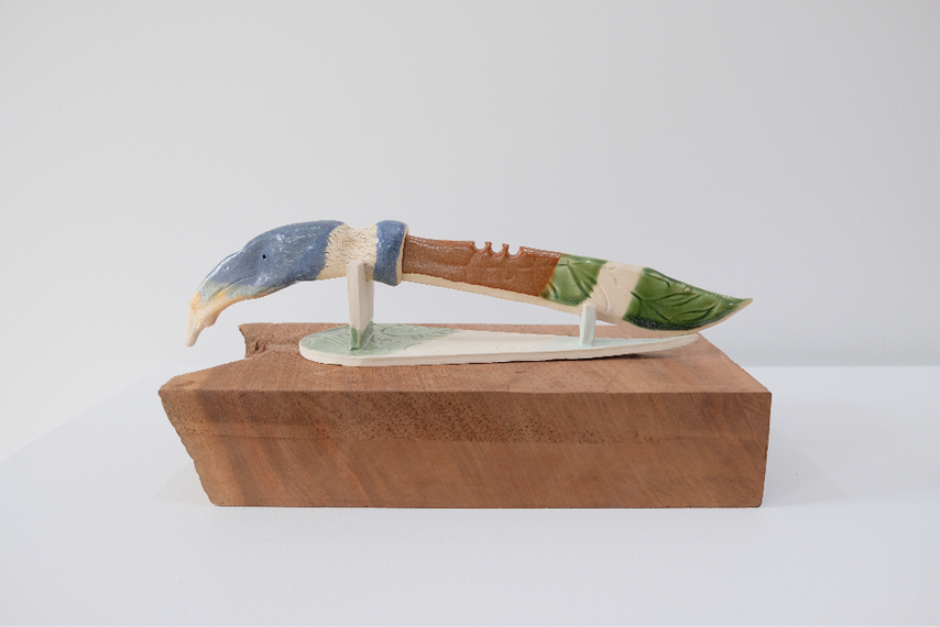 Parrot, ornametal knives, glazed ceramic, 13 X 2 X 2 in.