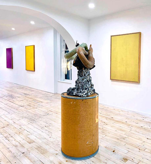 Hudson Valley-based artists Giordano and Cárcamo invite viewers into a mesmerizing realm of visual juxtaposition where Giordano’s breathtaking, iconoclastic, chimera-like assemblages harmoniously intertwine with Cárcamo's deceptively serene yet complex Kase Painting series. Although their styles may appear distinct and conflicting at first glance, Giordano and Cárcamo are multidisciplinary artists whose work touches on themes that incorporate high and low cultural references, art history, and urban culture.